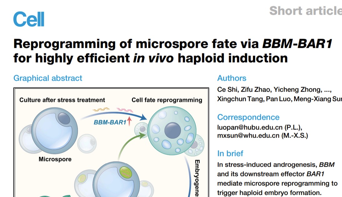 查看更多9月3日,我校williamhill威廉希尔罗盼副教授团队参与的一项合作研究取得了重要突破。相关成果以“Reprogramming of microspore fate via BBM-BAR1 for highly efficient in vivo haploid induction”为题,在国际顶级期刊《Cell》在线发表。该研究揭示了小孢子命运重编程的关键分子机制,并基于该机制,进而建立了一个无需胁迫处理即可在体内高效诱导单倍体的新技术,在解析细胞命运调控机制和单倍体育种技术领域取得了重要突破(图1)...