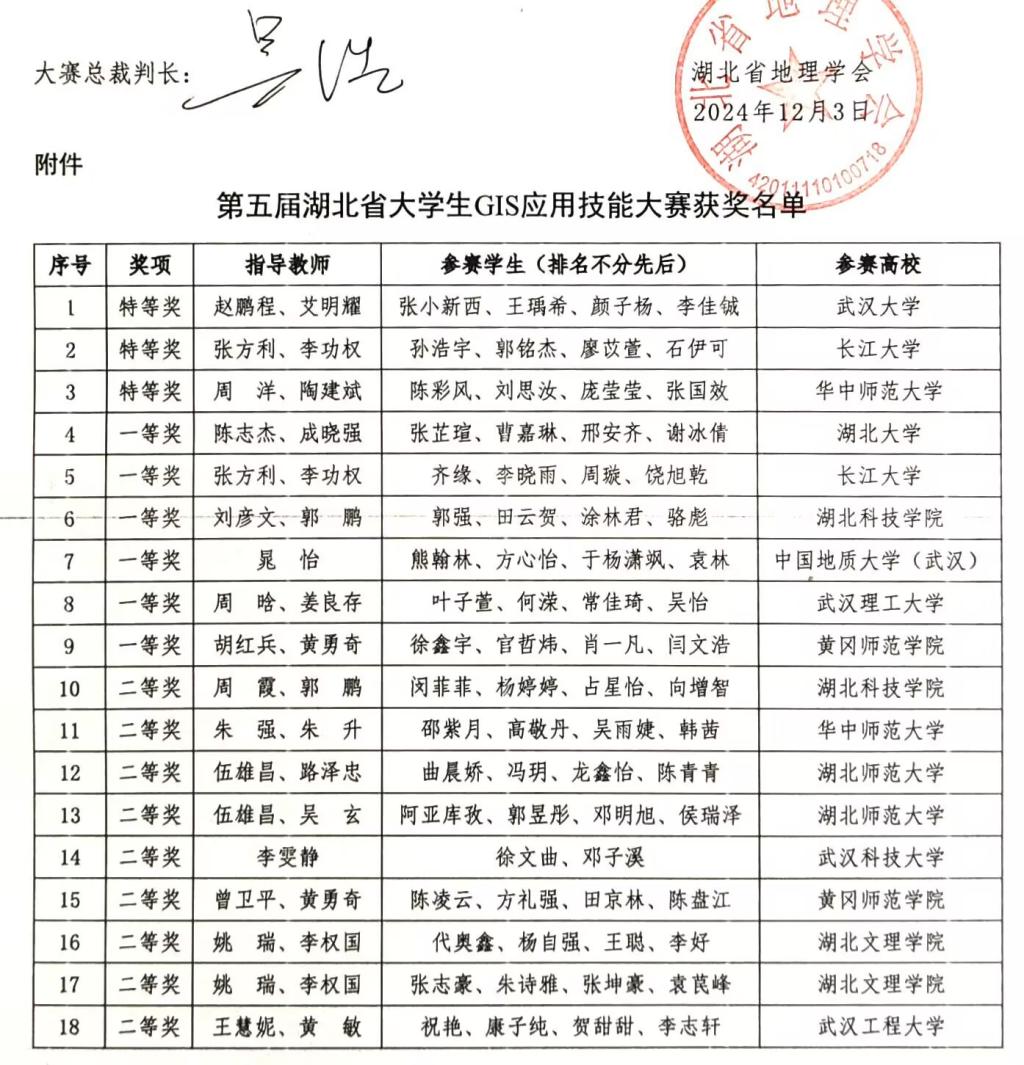 2024年11月9日,第五届湖北省大学生GIS应用技能大赛于武汉理工大学成功举办。11月22日-24日,第十三届全国大学生GIS应用技能大赛于兰州交通大学成功举办。我部陈志杰、成晓强老师指导的2022级地理信息科学专业学生团队(张芷瑄、曹嘉琳、邢安齐、谢冰倩)代表williamhill官网参与了国省两赛,且均斩获了一等奖的优异成绩。