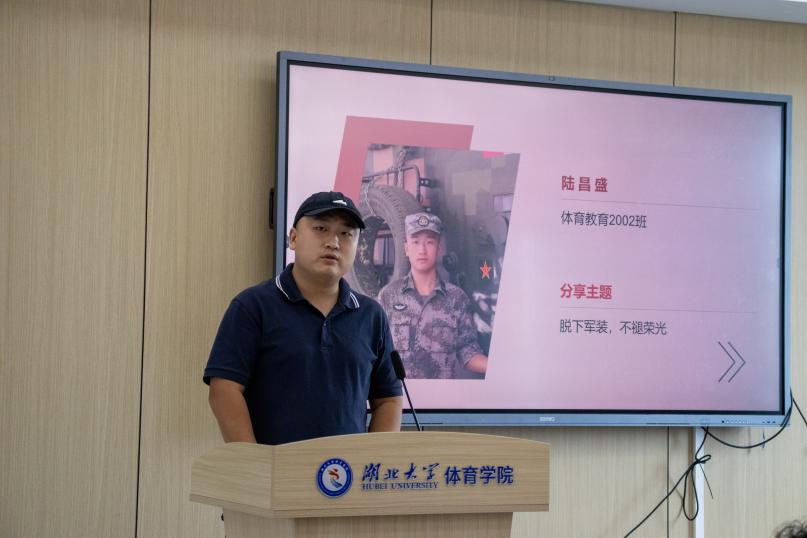 陆昌盛学长通过视频与现场讲述结合,回顾了自己从大学生到军人的转变,并介绍了退役后担任军训教官、参与家乡防汛志愿服务的经历,展现了军人本色在校园与社会的延续。
