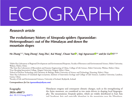 williamhill官网资源环境学院刘杰教授团队近日在《Ecography》(中科院SCI一区,IF = 5.4)上发表了题为“The evolutionary history of Sinopoda spiders (Sparassidae: Heteropodinae): out of the Himalayas and down the mountain slopes”的学术论文。