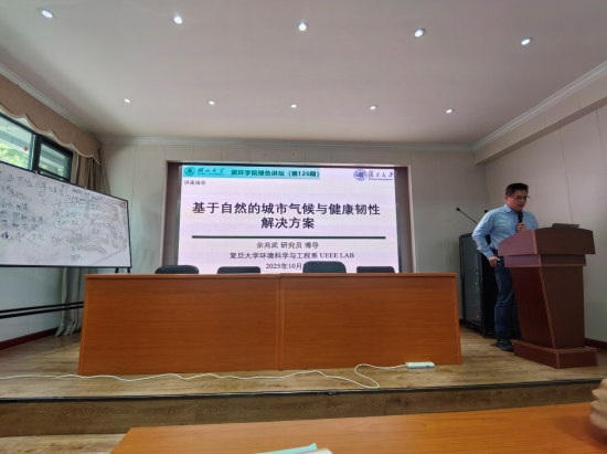 2025年10月24日,由williamhill官网资源与环境学院主办的绿色讲坛第126期讲座顺利举行。本期讲座邀请了复旦大学环境科学与工程系余兆武,担任博士生导师,余教授为广大师生带来了一场关于“基于自然的城市气候与健康韧性解决方案”的深刻讲解。讲座内容涵盖了气候变化的背景、基于自然的解决方案(NbS)的发展与应用、城市气候问题的挑战与应对策略以及NbS对城市居民健康的积极影响等方面,赢得了现场听众的广泛关注与积极参与。