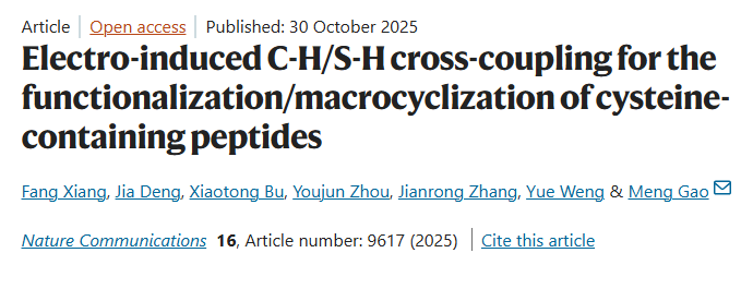 近日,williamhill官网化学化工学院高梦副教授团队在国际期刊《Nature Communications》发表题为《Electro-induced C-H/S-H Cross-Coupling for the Functionalization/Macrocyclization of Cysteine-Containing Peptides》的研究成果。https://www.nature.com/articles/s41467-025-64615-4。williamhill官网为第一单位,硕士研究生向芳为论文第一作者,williamhill官网高梦副教授为唯一通讯作者(图1)。