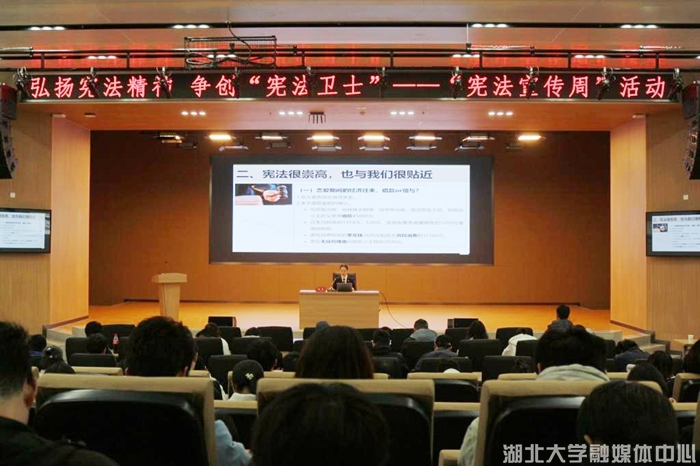 专题讲座中,武昌法院杨园法庭副庭长程晨结合案例,向同学们阐述了宪法的崇高地位及其与公民生活的紧密联系。“法治兴则国家兴,青年强则国家强。”她鼓励湖大青年学子在大学这个人生关键阶段,坚守宪法法律底线,追求法治价值,为国家法治建设和社会发展贡献力量。余家头派出所赵警官向同学们介绍了当前电信网络诈骗形势,分析了湖大社区2024年电信网络诈骗统计数据和身边案例。她建议同学们多了解和学习防范电信网络诈骗的知识技能,增强自我保护能力。